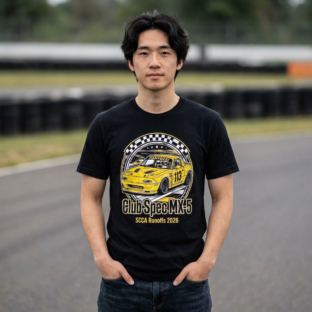 This tee celebrates the raw joy of track days and grassroots racing. The front features a bold, hand-illustrated MX-5 with racing number and checker-arched logo, printed in high-contrast yellow and distressed tones for a lived-in, vintage look. It feels like the shirt you grab after a long day of wrenching and hot laps — comfortable, breathable, and built to keep its shape through washes and weekends at the paddock. Wear it to SCCA meetups, runoffs, or when you’re swapping stories in the garage; it speaks the language of clutch kicks, apexes, and shared track memories.